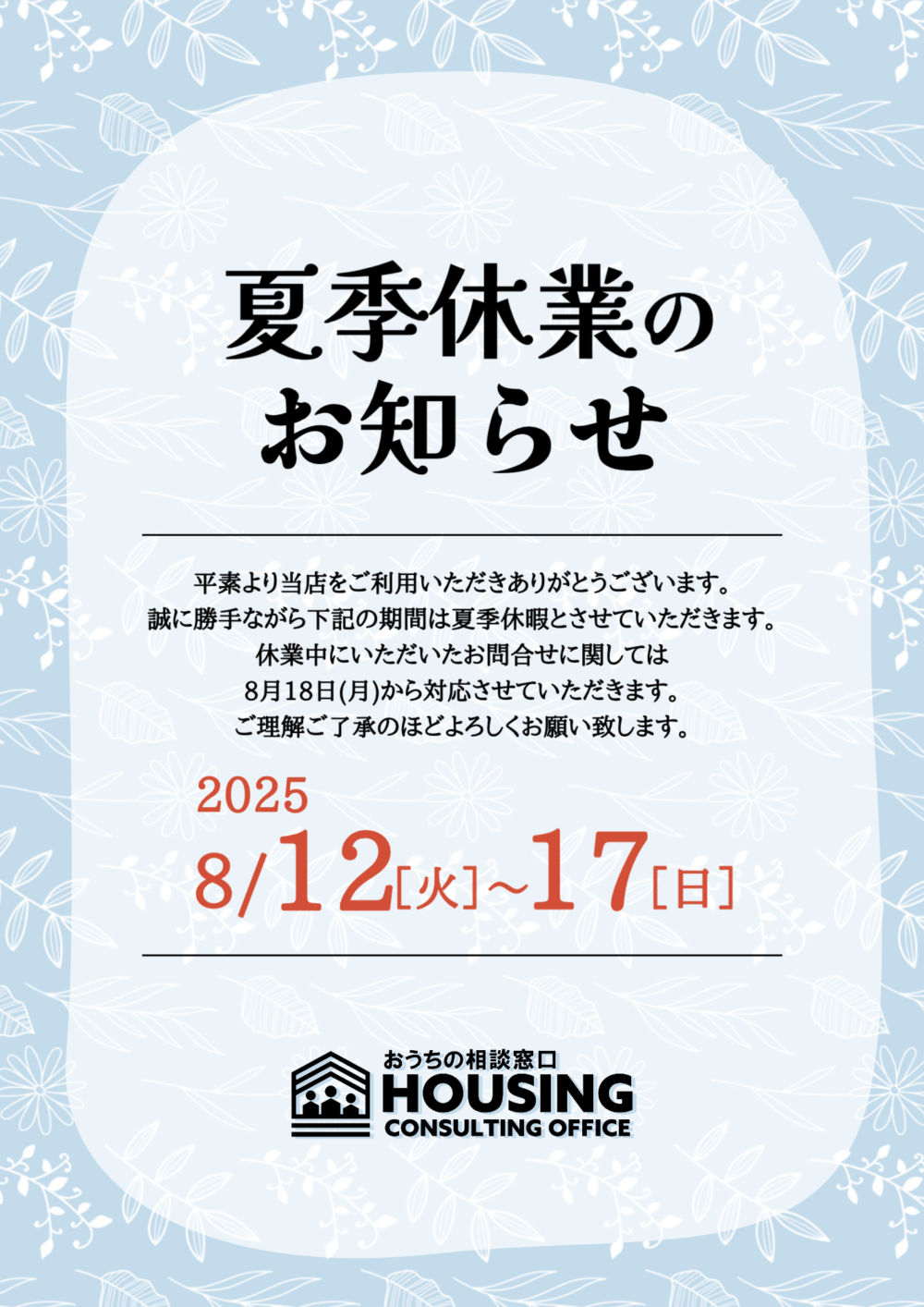 ■夏季休業期間 2025年8月12日㈫~2025年8月17日㈰
